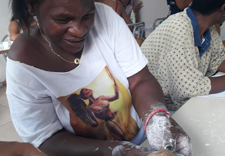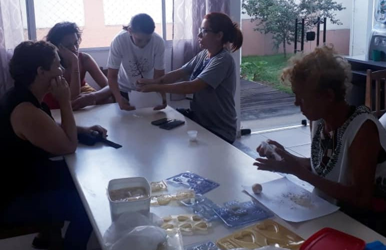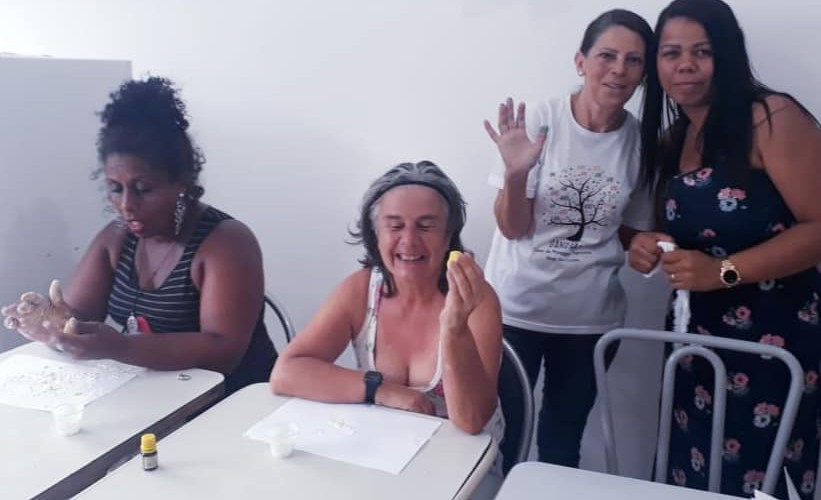 Com a supervisão da coordenadora Neuza Oliveira, a oficineira Marisa ensinou a técnica biscuit de sachês com o apoio das voluntárias Patrícia Bonifácio, Eda; do Centro Pop, psicóloga Silvana e os educares sociais Estêvão, Jasy, Ivana e Márcia.