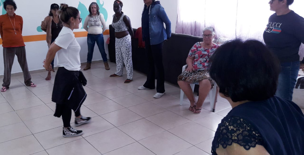 Foi promovida oficina de alongamento, com o objetivo de estimular a concentração e respiração e a oficina de zumba com o intuito de proporcionar vigor, animação e bem-estar para as acolhidas.